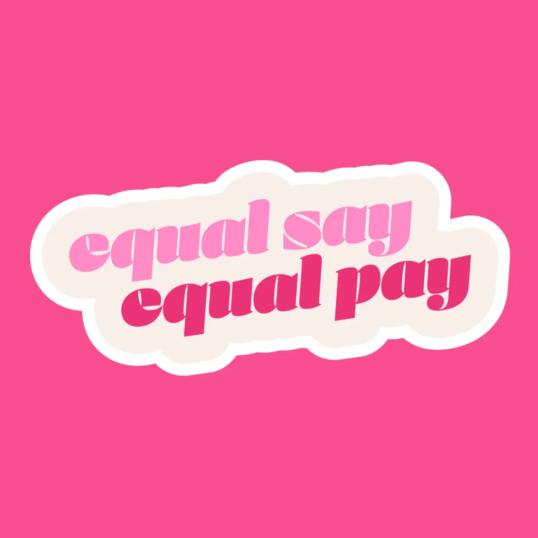 - White background with pink and red lettering "Equal Say Equal Pay"