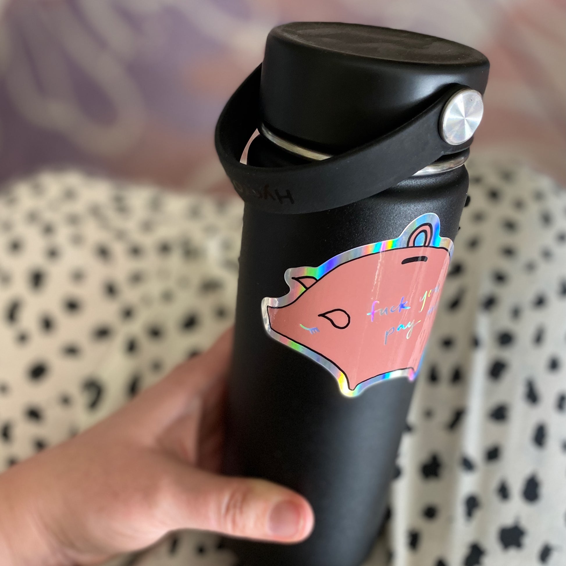 - holographic vinyl sticker measures 3.33″ × 2.72″