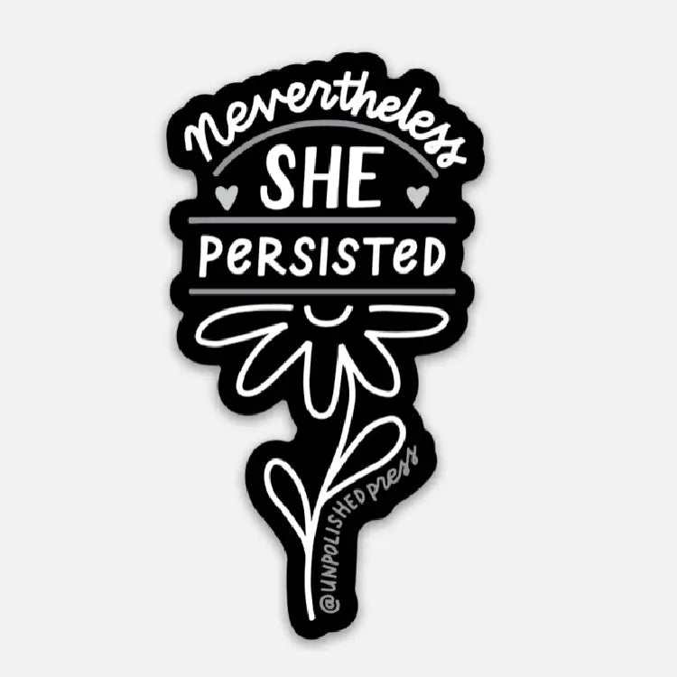 - White cursive lettering "Nevertheless SHE PERSISTED" above a white line illustration of a flower stem on a black background