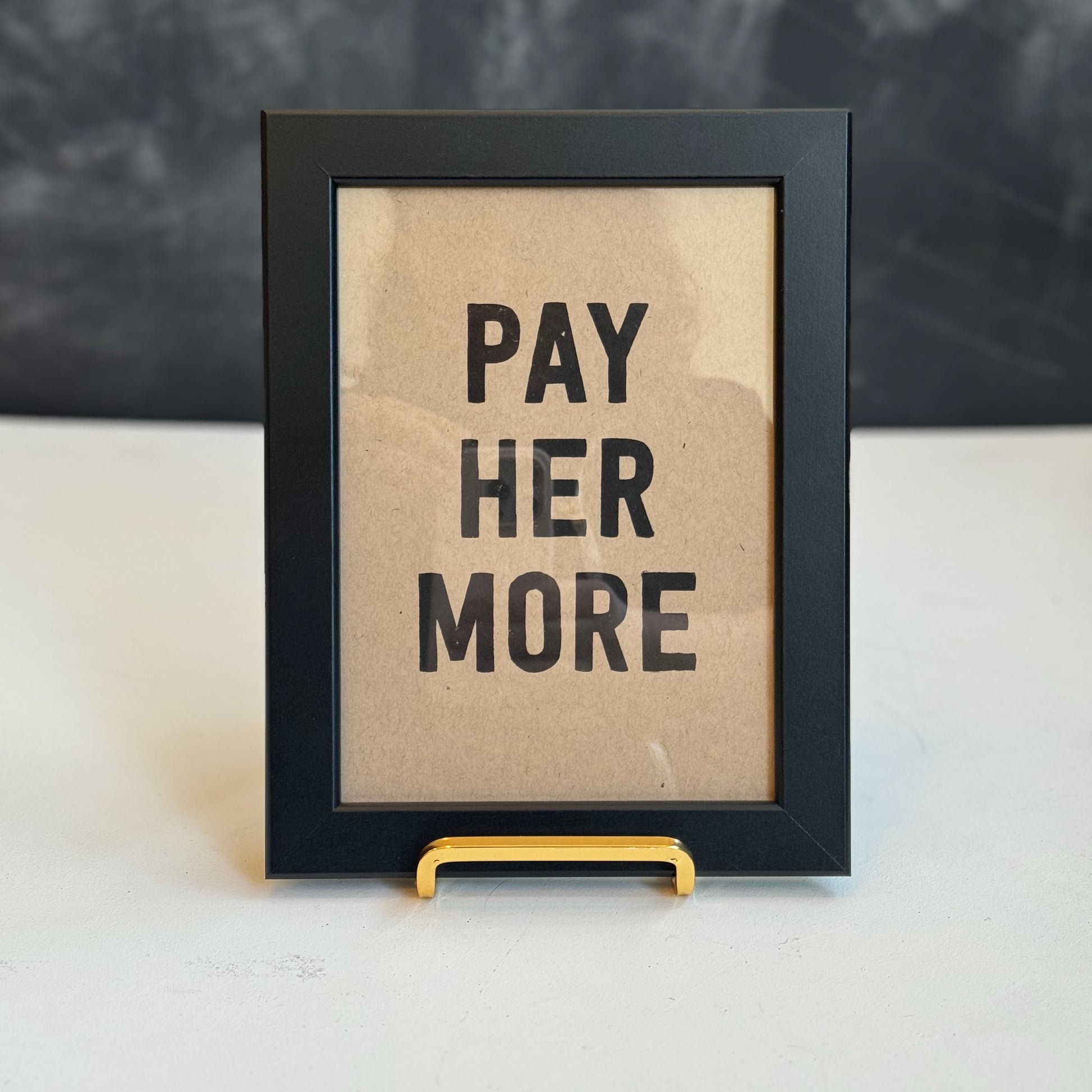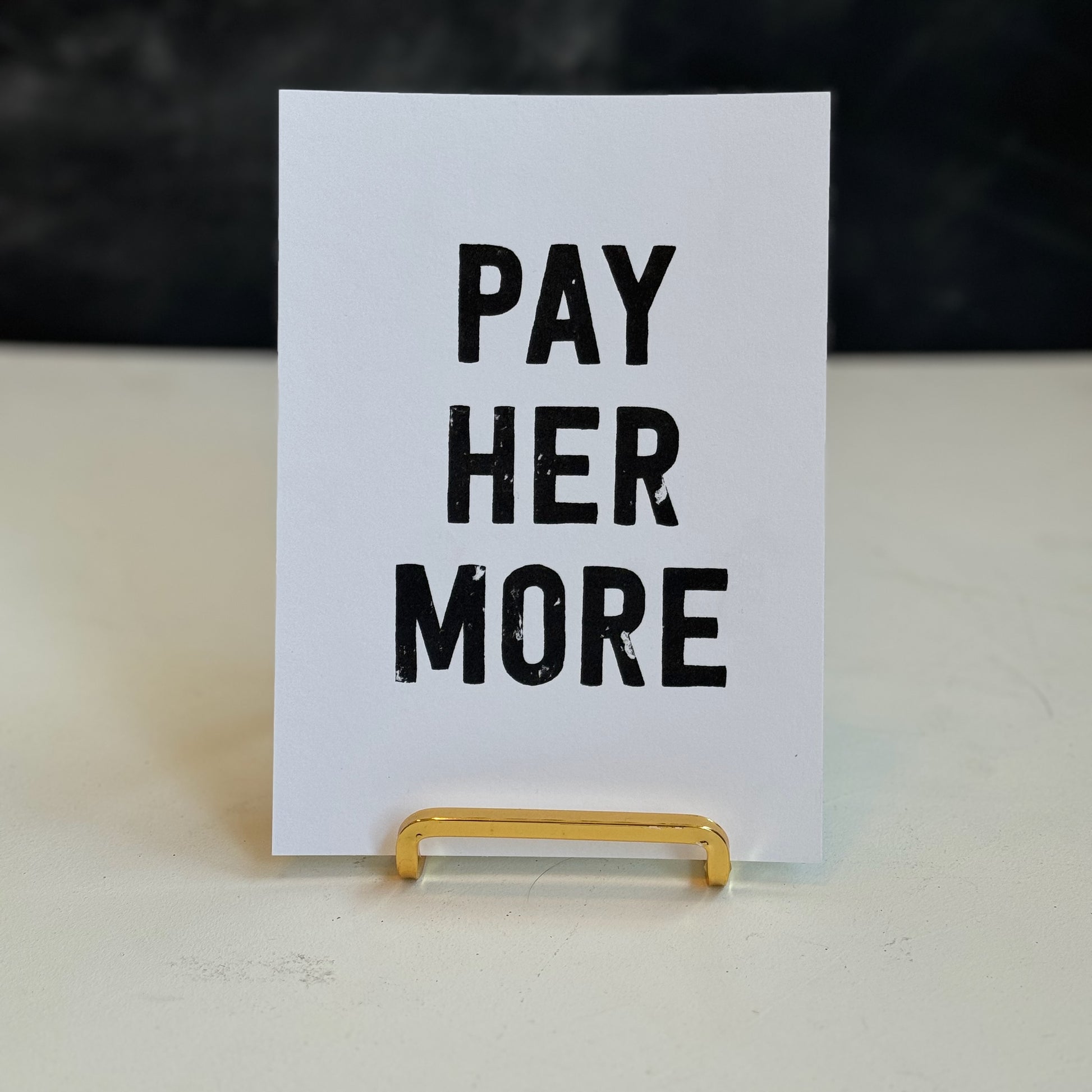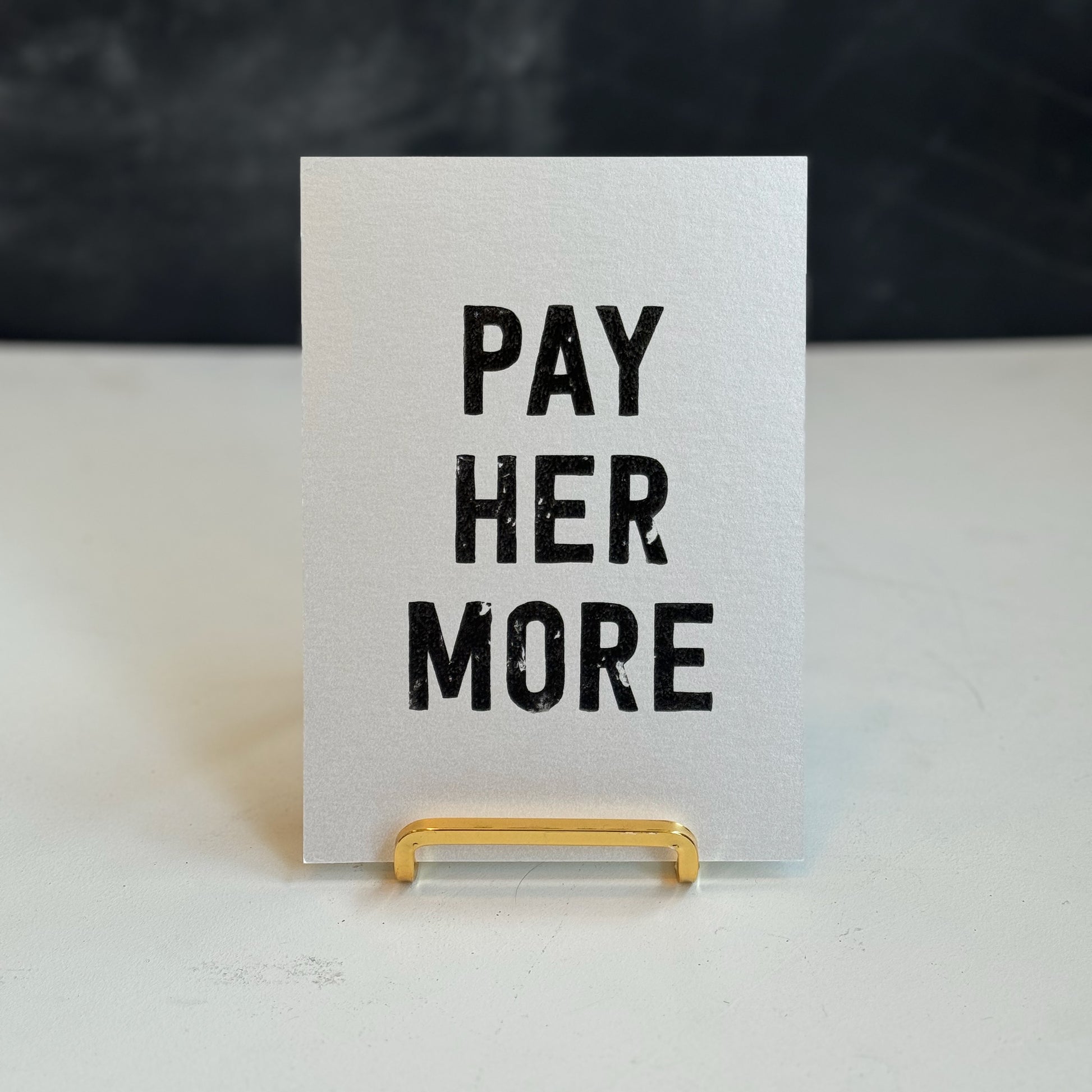 a handmade 5x7 print with the words PAY HER MORE in bold caps in black ink. each print has unique variations from the gocco screen printing process.